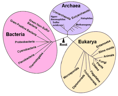 The organisms living on Earth today are broadly divided into three large domains: Bacteria, Archaea and Eukarya (Protista, Plants, Fungi and Animals). Our understanding of the relationship between the three domains is undergoing big changes right now. The old divisions have been based on morphological and biochemical differences, but recent genetic data are forcing us to rethink and revise the way we think about the three Domains.